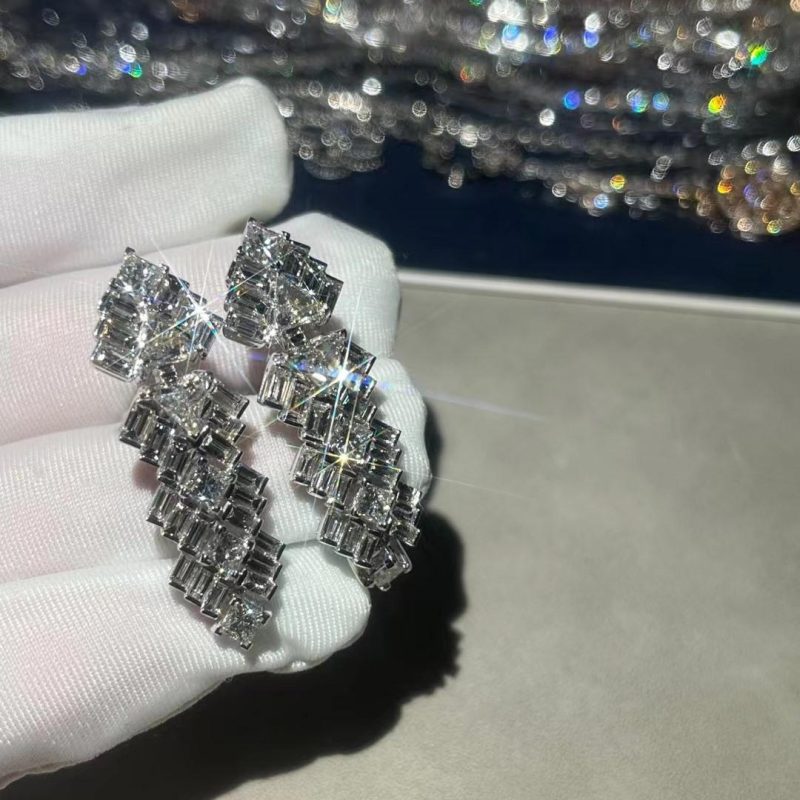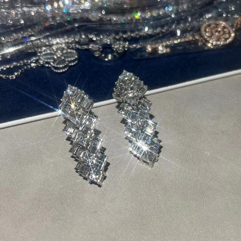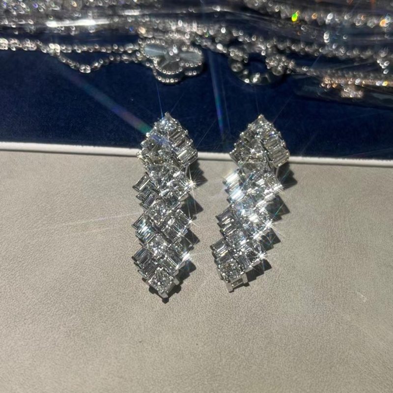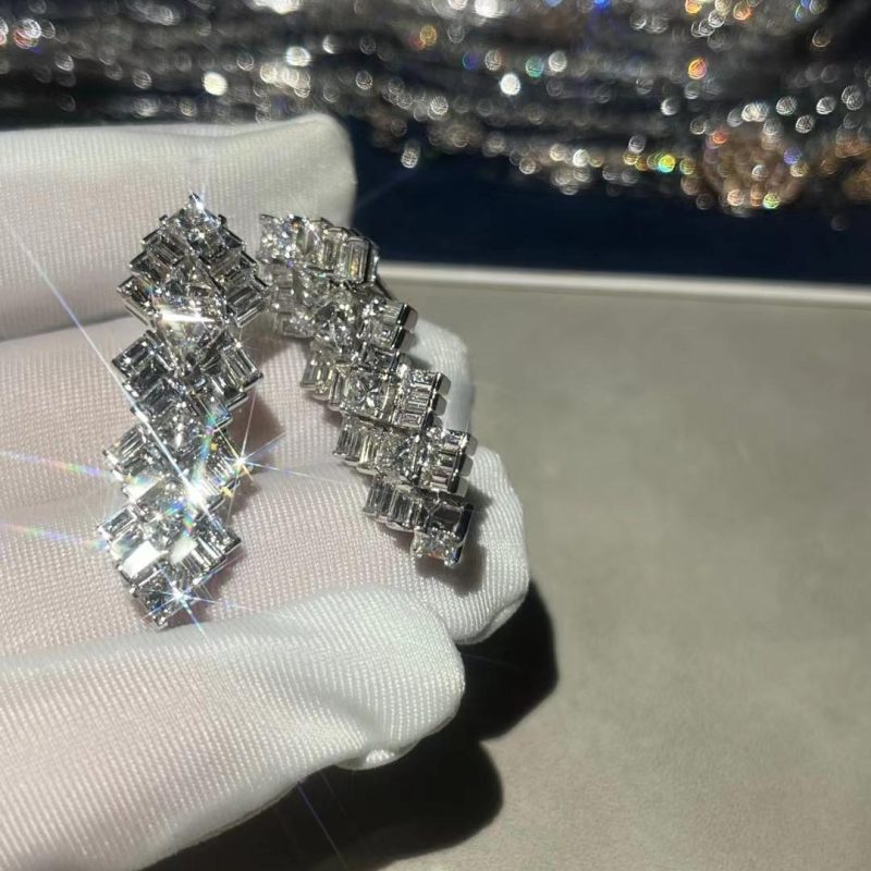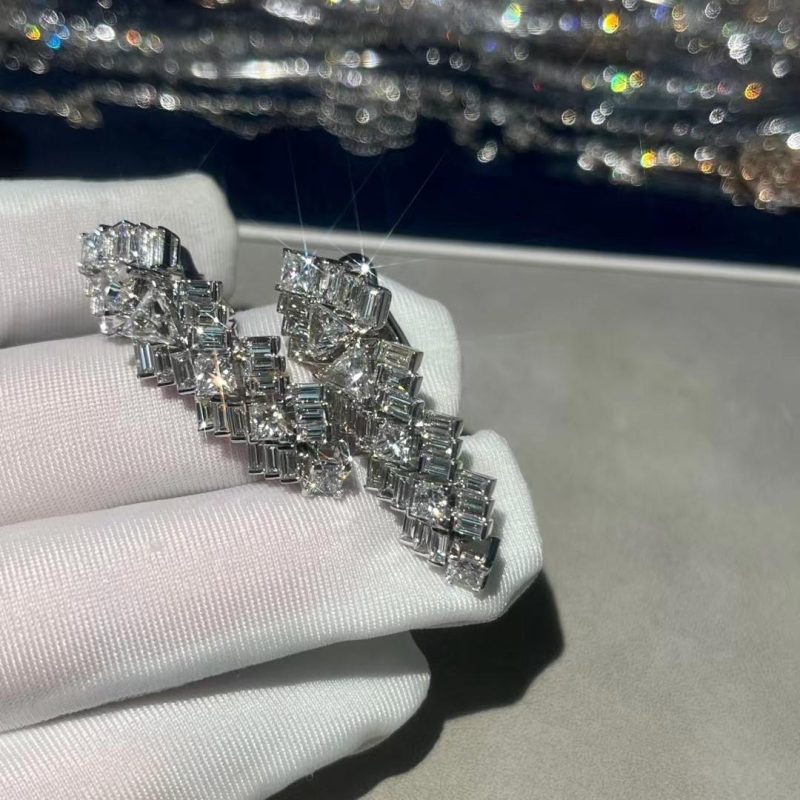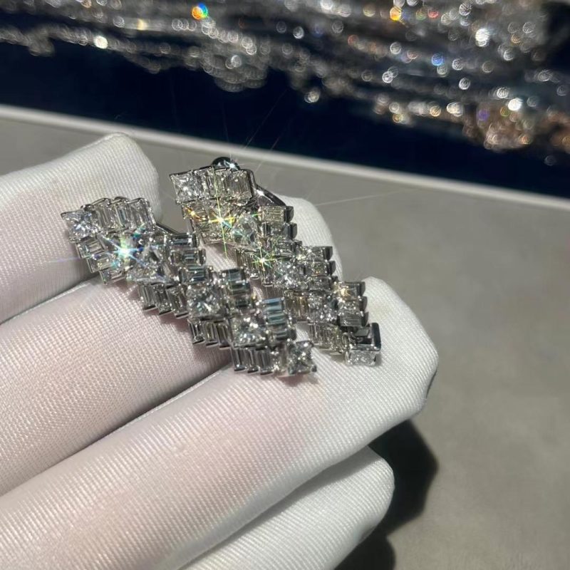 The Reflection de Cartier earrings are made of 18K white gold and feature 24 baguette-cut diamonds totaling 5.63 carats. In addition to these diamonds, the earrings also feature four princess-cut diamonds and two troidia-cut diamonds. Each pair of earrings is unique in terms of carat weight, the number of stones, and the size.