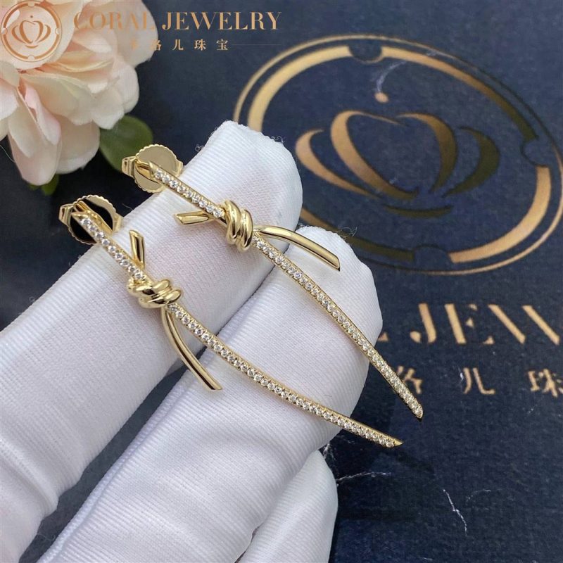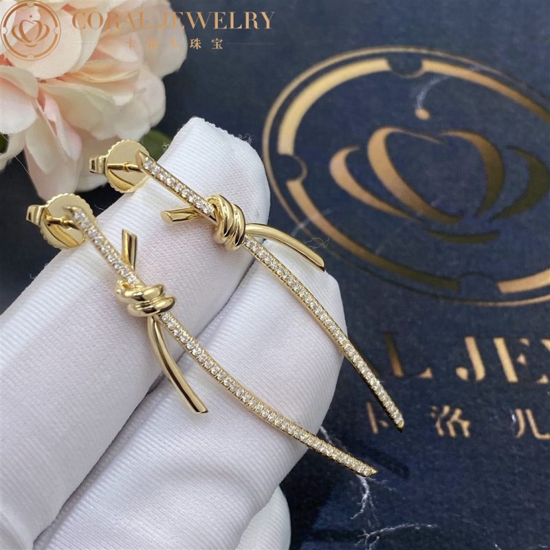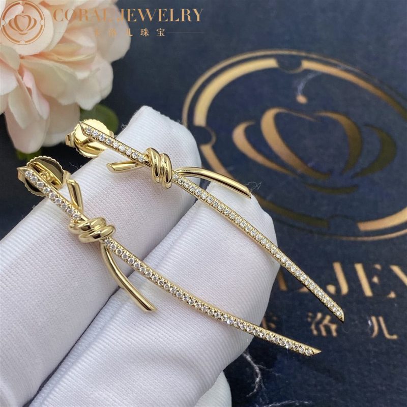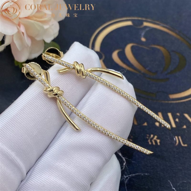 The entwined ends of Tiffany Knot’s signature motif symbolize the power of connections between people. Balancing strength and elegance, each Tiffany Knot design is a complex feat of craftsmanship. These drop earrings are crafted with yellow gold and pavé diamonds, then polished by hand for high shine. Each round brilliant diamond—specifically chosen to meet Tiffany’s high standards—is hand set at precise angles to maximize brilliance. Wear these earrings on their own for maximum impact.