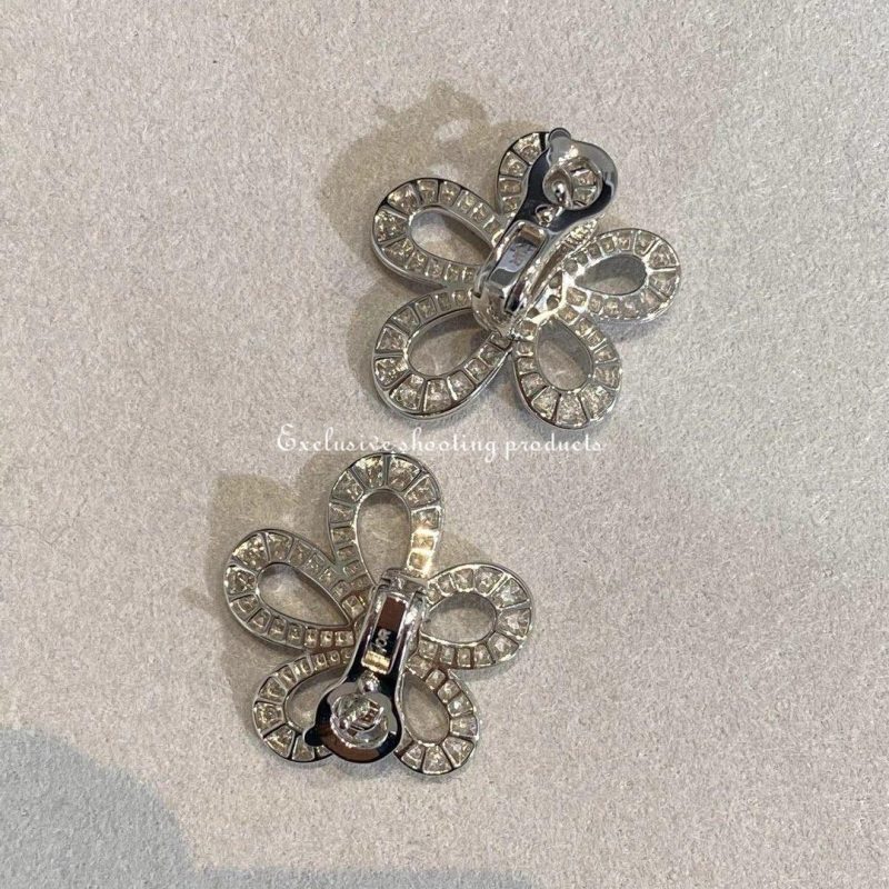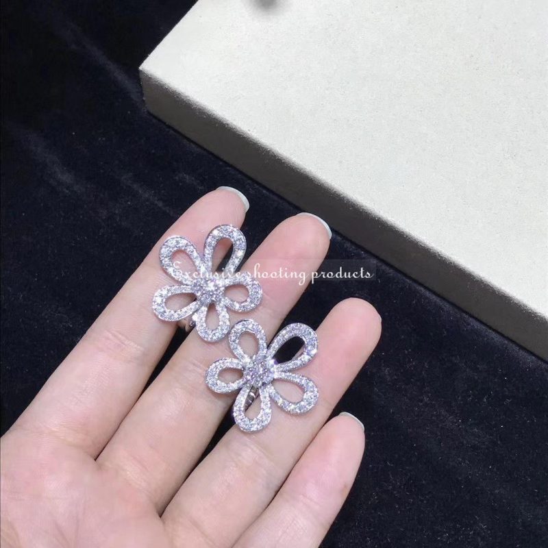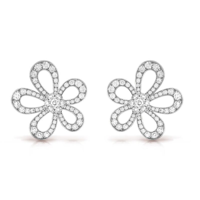 The VCARP05100 Flowerlace earrings are a fine example of this. The open flowers feature a total of 144 pave-set round brilliant cut diamonds. The design is very beautiful, and the earring is made of 18 karat white gold.