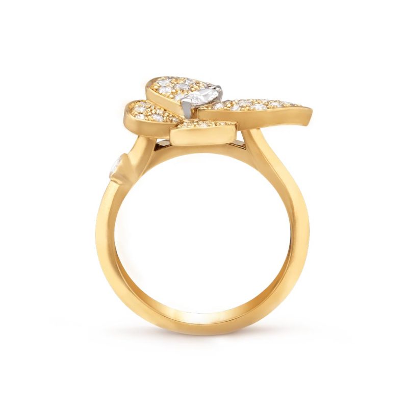 The two-tone design of the ring is inspired by the symmetry of the wings of a butterfly. It also features an openwork design. In addition to the ring, the Flying Butterfly collection includes a knife edge band, marquise-cut diamonds, and 68 round brilliant cut diamonds.